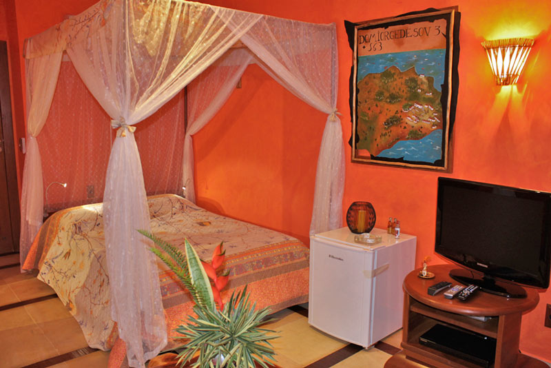 No 1° andar. Totalmente decorada com tecidos finos. Cama super king size, ar condicionado, TV LCD 32', DVD, hidromassagem, frigobar, cofre, secador de cabelos, amplo espaço no banheiro com duplas cubas e amplo closet com grande espelho.